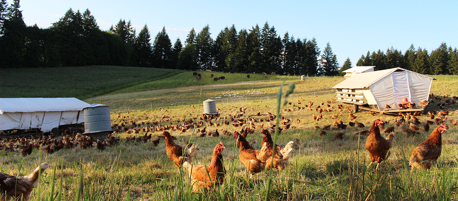 Here at Champoeg Farm, we have raised everything from Pigs and Cows to Ducks, Rabbits and Broiler Chickens. We might possibly be best known however for Pasture Raised Eggs since we sold them through many New Seasons Market locations and at the Beaverton Farmers Market. However, after the struggles of juggling all the various species, we didn’t find it a good fit for us. We decided a few years ago to turn our focus to more consistent production of Pasture Raised Poultry and the ability to process on farm. This allows us to be a bit more seasonal and to primarily custom raise for mid-sized cafes and restaurants where we can match required volumes consistently.