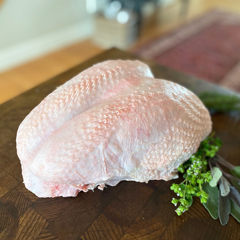 For the holidays, we are offering a Pasture Raised, Bone-In Turkey Crown Breast with Skin. This is a beautiful option if breast meat is your favorite!